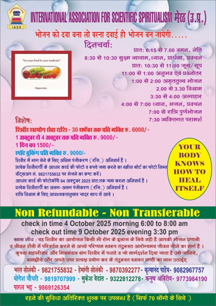 | 08.30 से 10.30 | ध्यान, प्रार्थना, सुक्ष्म व्यायाम, प्रवचन, सात्विक नाश्ता |